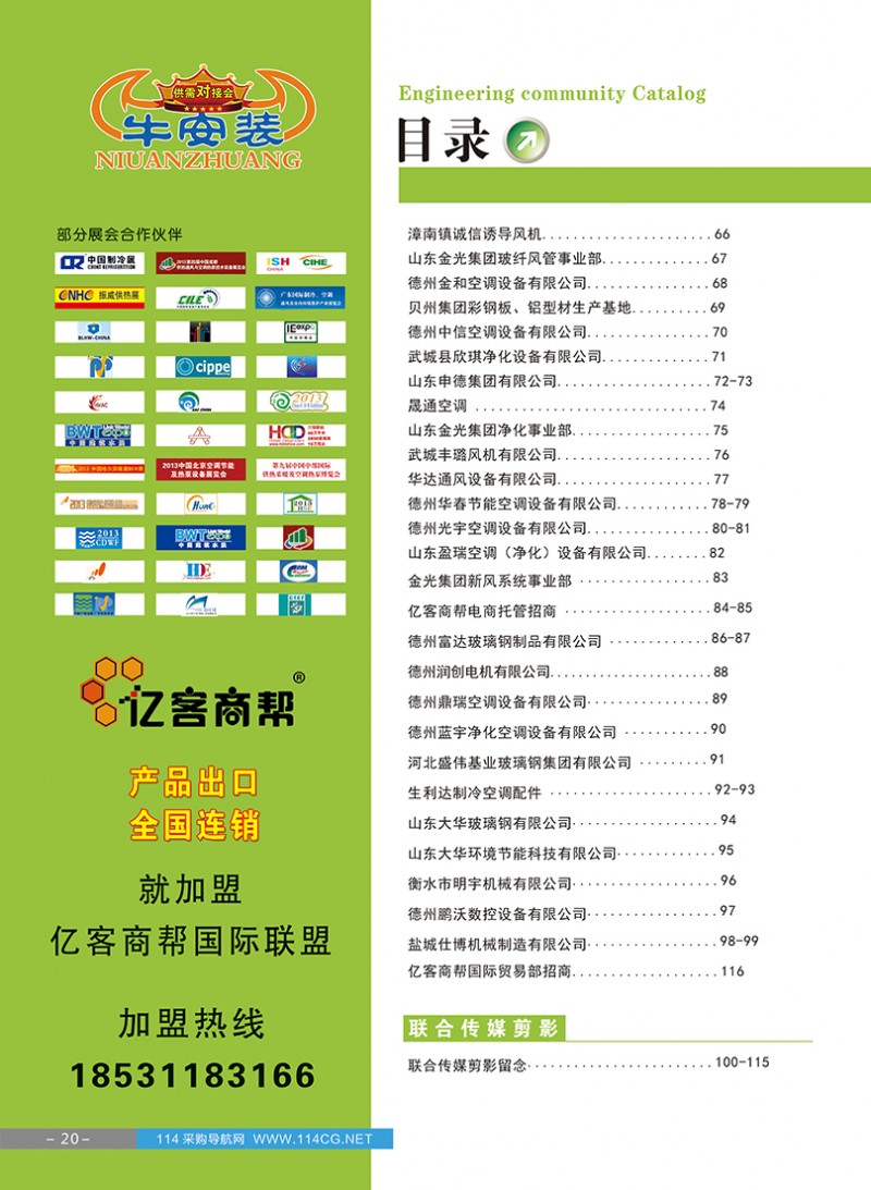 入編內容:玻璃鋼系列產品、水箱系列產品、冷卻塔系列產品、玻璃鋼生產設備及原材料、 中央空調制冷系列產品、中央空調配套設備、空調末端系列產品、凈化除塵系列產品、機房水處理設備、通風設備及配件系列產品、機電設備及自動化控制系列產品、行業設備及設備配件、計量及檢測 儀器、熱泵供暖產品、低炭節能產品等工程采購信息為主,針對性強,信息真實可靠,查閱方便快捷,是一本很好的工程采購決策者、工程采購執行者、工程采購負責者必備的采購工具書。